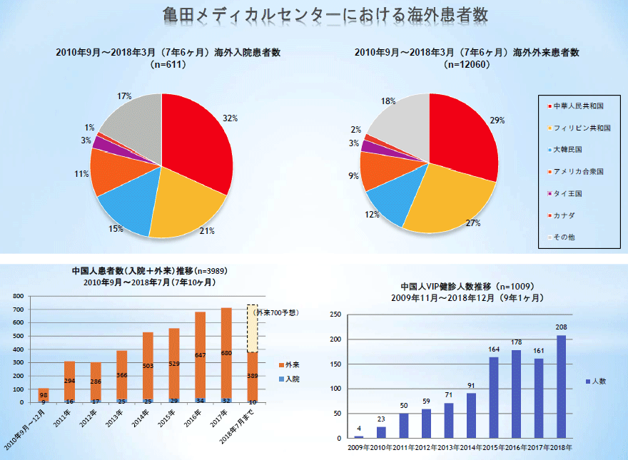 - 4. 龟田医疗中心是一所集高水平的医疗、高水准的服务、优雅的医疗环境(地处太平洋畔)为一体的大型医疗中心。由于取得了JCI国际认证,龟田医疗中心特意为海外朋友(特别是中国朋友)来本中心体检、治疗开辟了绿色通道,提供细致周到的医疗服务。包括入住我院VIP房间(数量有限),安排院内餐厅餐饮(西餐、日餐),为个人特制体检套餐(限第二次以后来院检查的就诊者)。体检全程由本中心职员(向导,翻译)陪同,体检结束后可讲解体检结果(当天能够出来的结果)。申请套餐的朋友还可免费游览日本国内著名的”鸭川海洋世界”,观看精彩的虎鲸表演等。